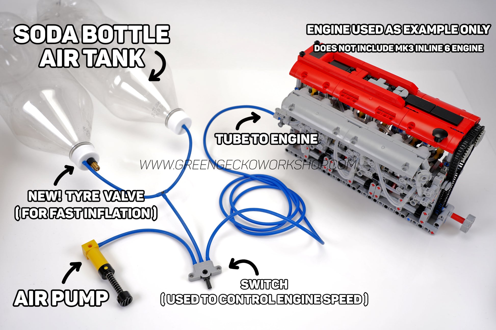 Please Note: The Engine in the Second Photo is for Example only, this Soda Bottle Air Tank Kit does not include the MK3 Inline 6 Cylinder Engine.